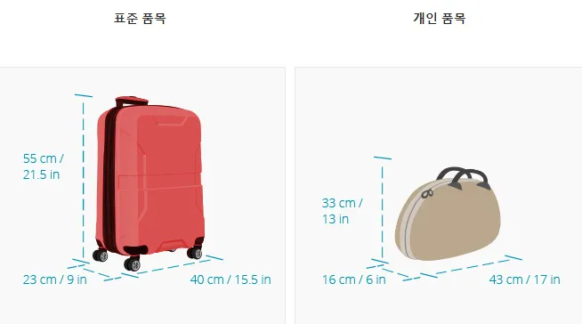 목적지에 관계없이 표준 휴대물 1개 + 개인 휴대물 1개를 휴대할 수 있습니다.