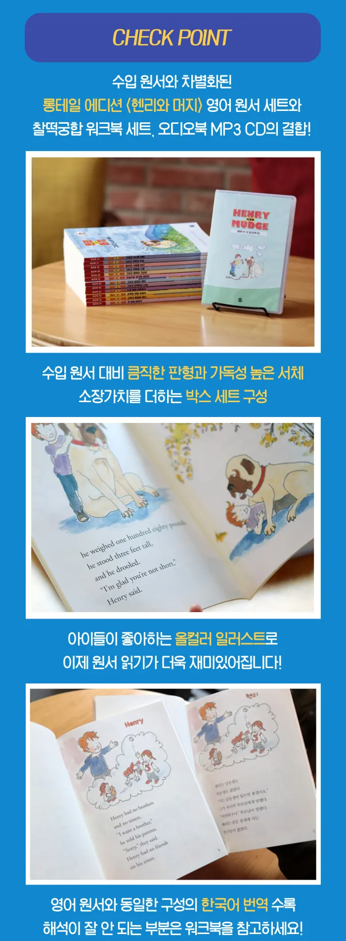 한국어 번역본이 수록되어, 영어가 부족한 어린이들도 쉽게 재미를 붙일 수 있고, 엄마표/아빠표영어에 활용하기에도 좋습니다.