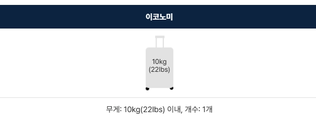 수하물 1개(캐리어 또는 백팩)+ 서류가방, 노트북가방, 핸드백, 소형 백팩, 작은 면세품 중 1개