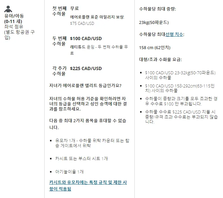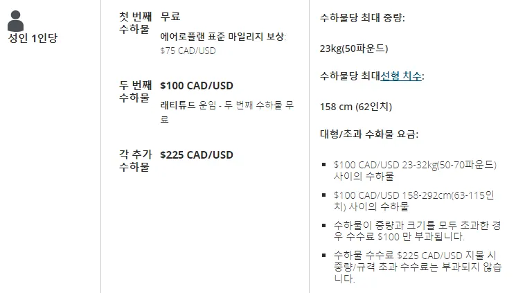 두 번째 위탁 수하물 : 23KG까지 100CAD(한화로 약 10만원)