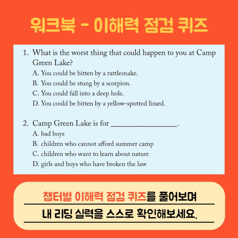 챕터별 이해력 점검 퀴즈가 수록되어 리딩 실력을 스스로 점검할 수 있습니다.